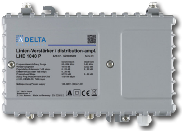 LHE 1040 P: Push-Pull-40 dB-Verstärker, 32 / 40 dB umschaltbar / 65 MHz-Rückwegverstärker 22 / 32 dB an Bord Präzise und zuverlässige Einstellung über PAD’s